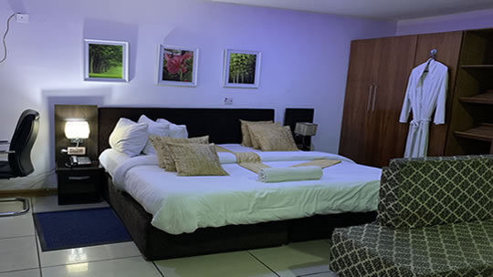 24, Iyala Street, Beside Ikeja Shopping Mall, Alausa-Ikeja, Lagos The guest rooms which are expensively styled to International standard are fitted with refrigerators, flat screen TV, wireless connection, study desk and table, mirror, lamps, centre table, air conditioners, toiletries, water heater, towels and en-suite bathrooms. These rooms are categorised into Belair room, Oxford, Oxford Deluxe room, Long Island and Jersey room.
